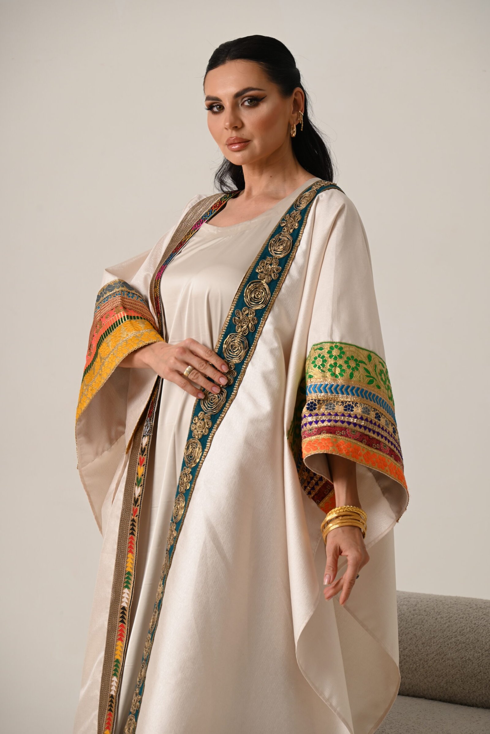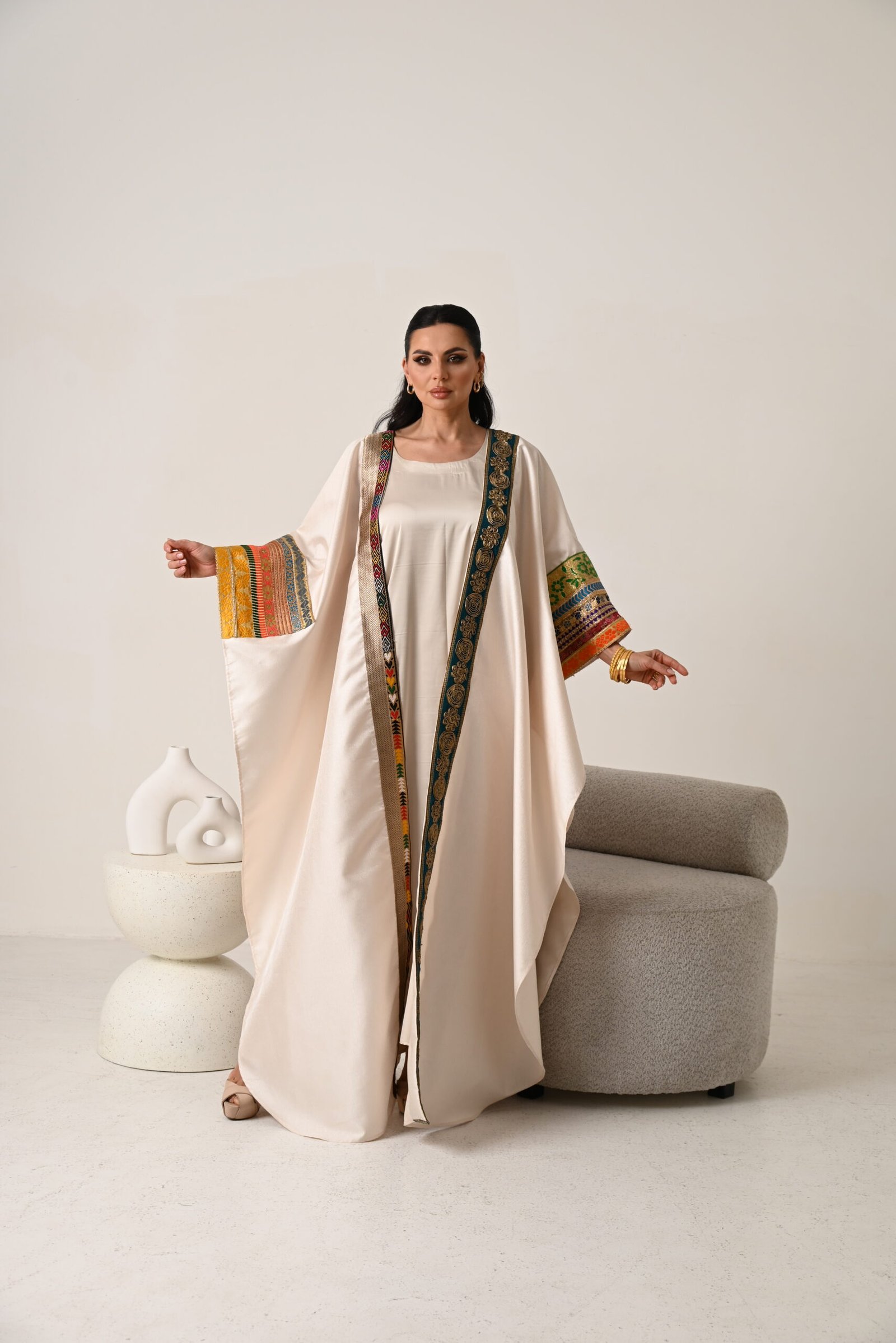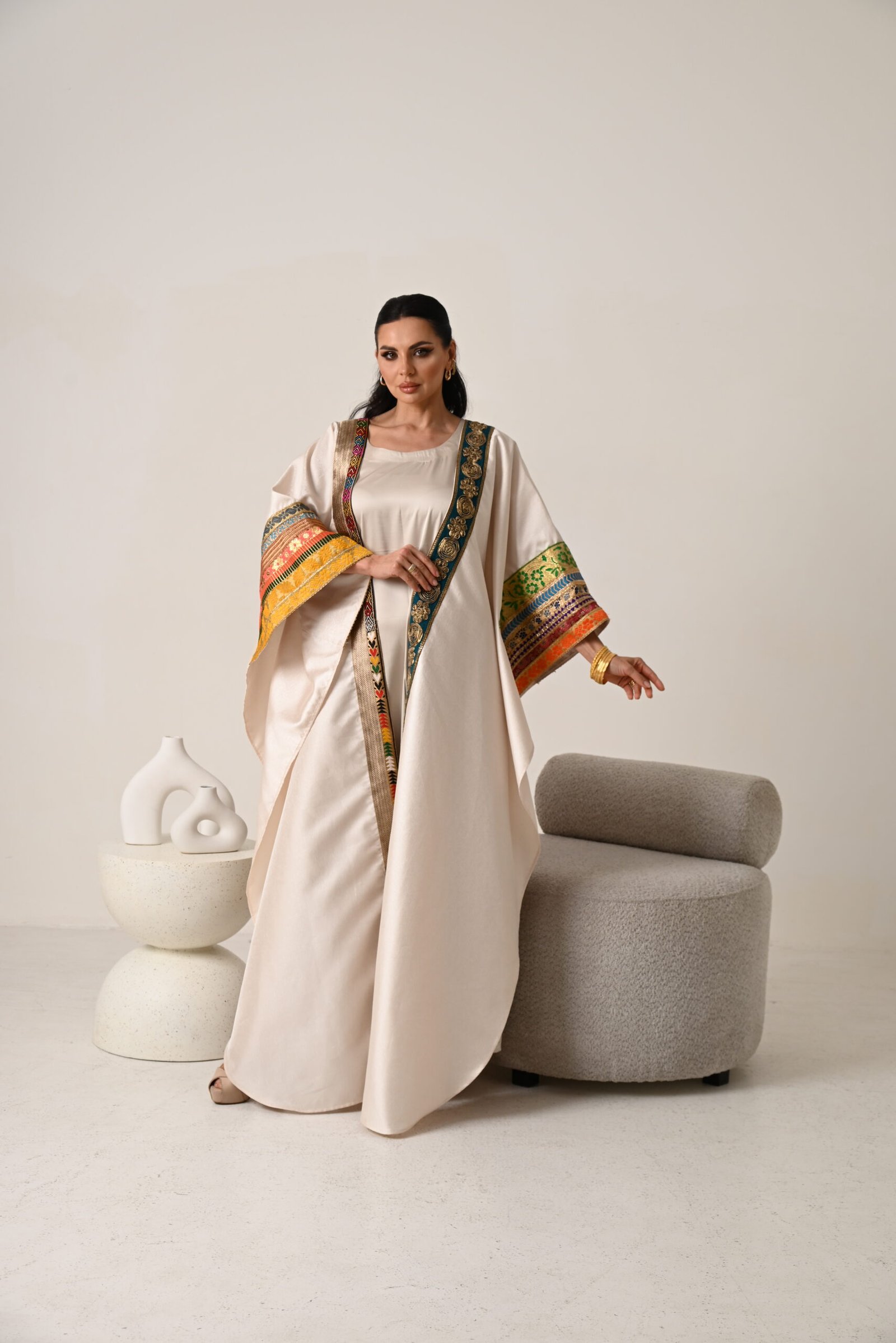 جلابية بيج تجمع بين الأناقة الخليجية والتطريز الراقي، مثالية للمناسبات الخاصة، تتميز بتصميم مميز ولون بيج هادئ يضفي لمسة فخامة ونعومة في آن واحد.