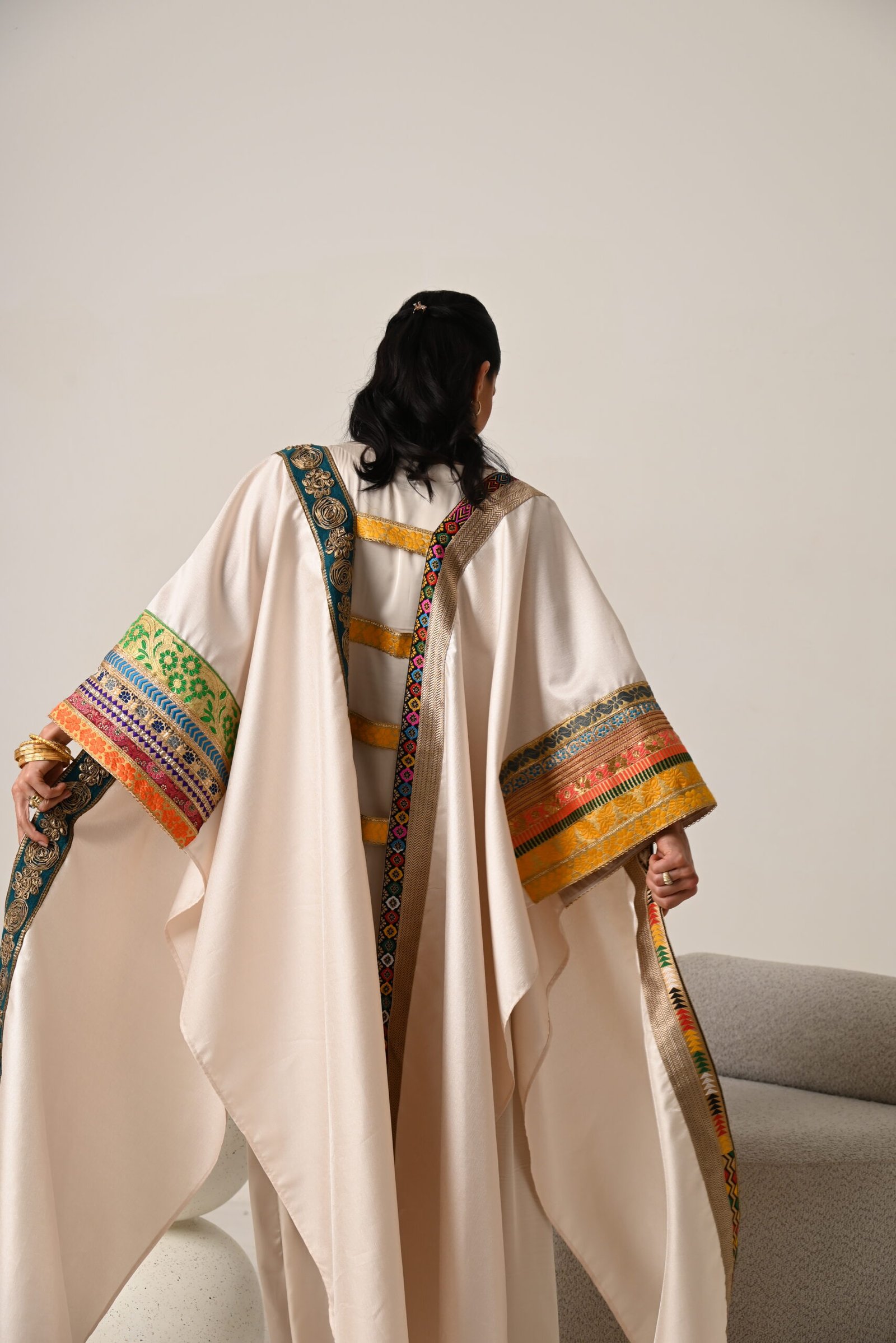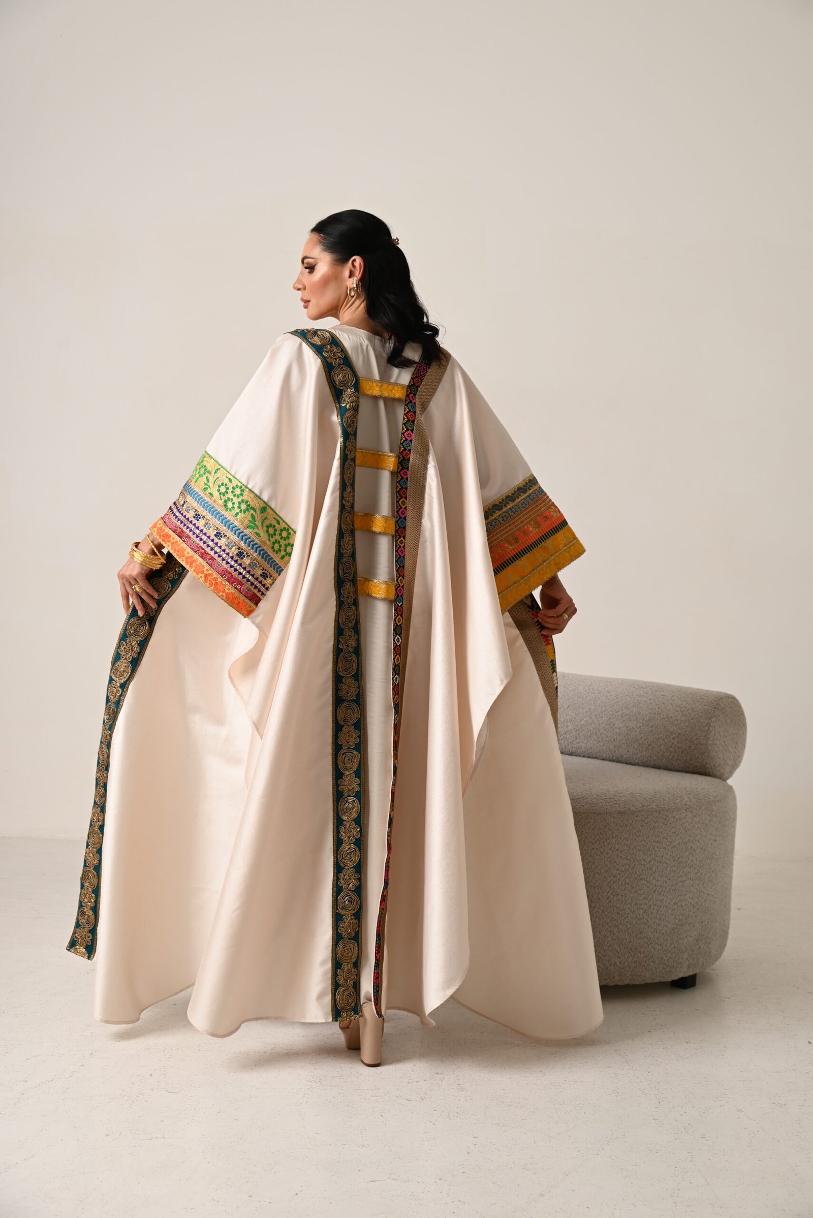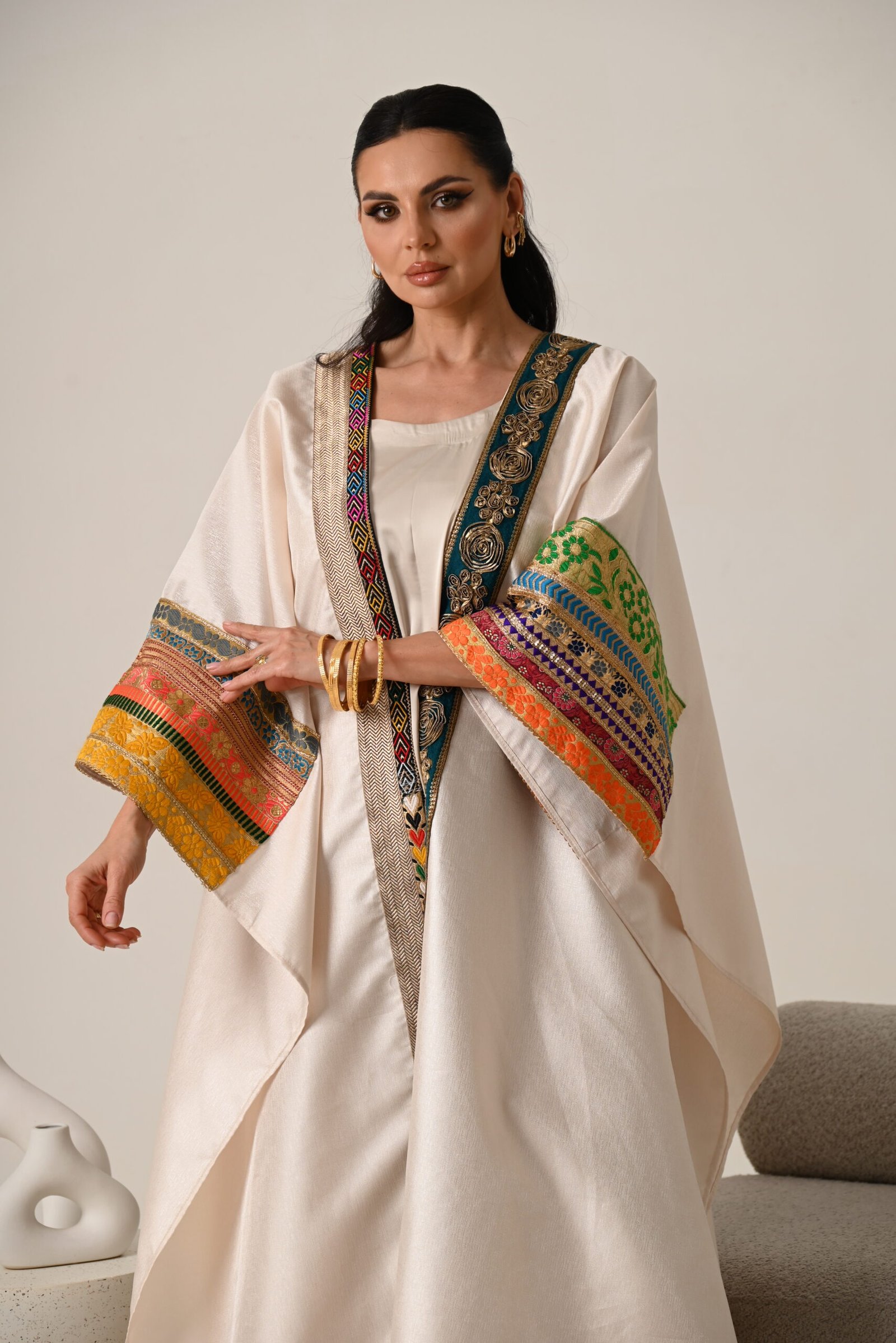 جلابية بيج تجمع بين الأناقة الخليجية والتطريز الراقي، مثالية للمناسبات الخاصة، تتميز بتصميم مميز ولون بيج هادئ يضفي لمسة فخامة ونعومة في آن واحد.