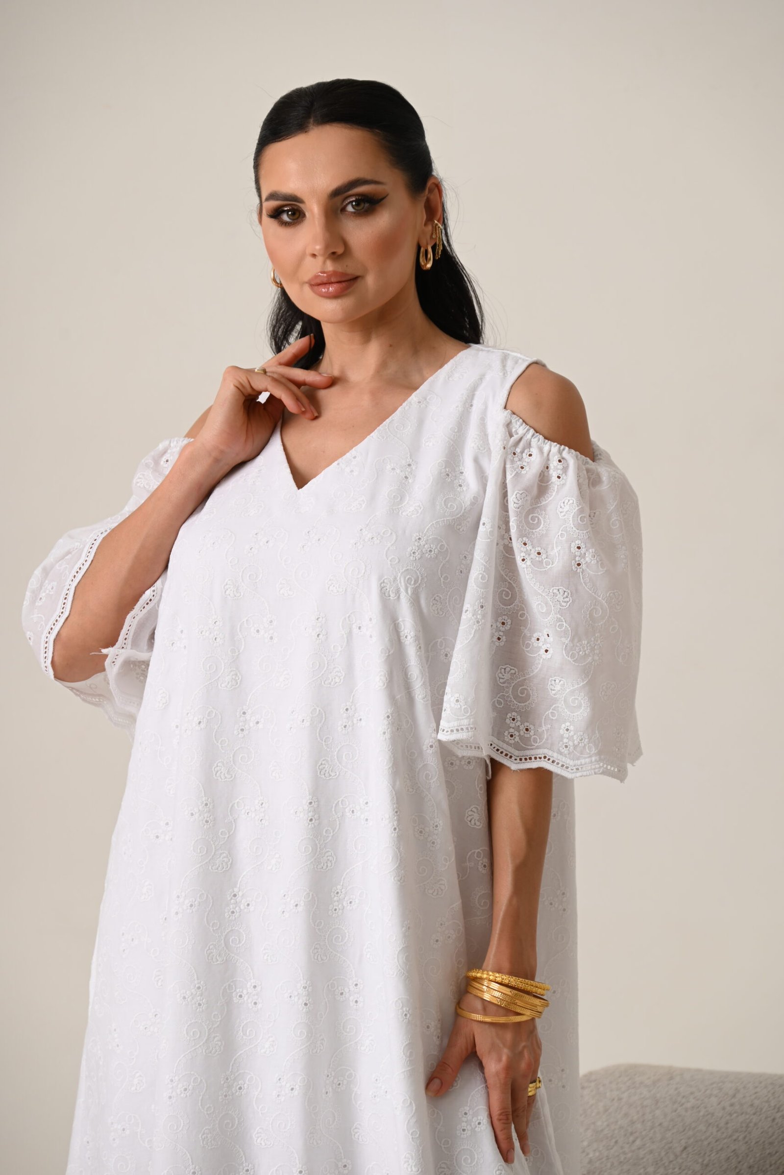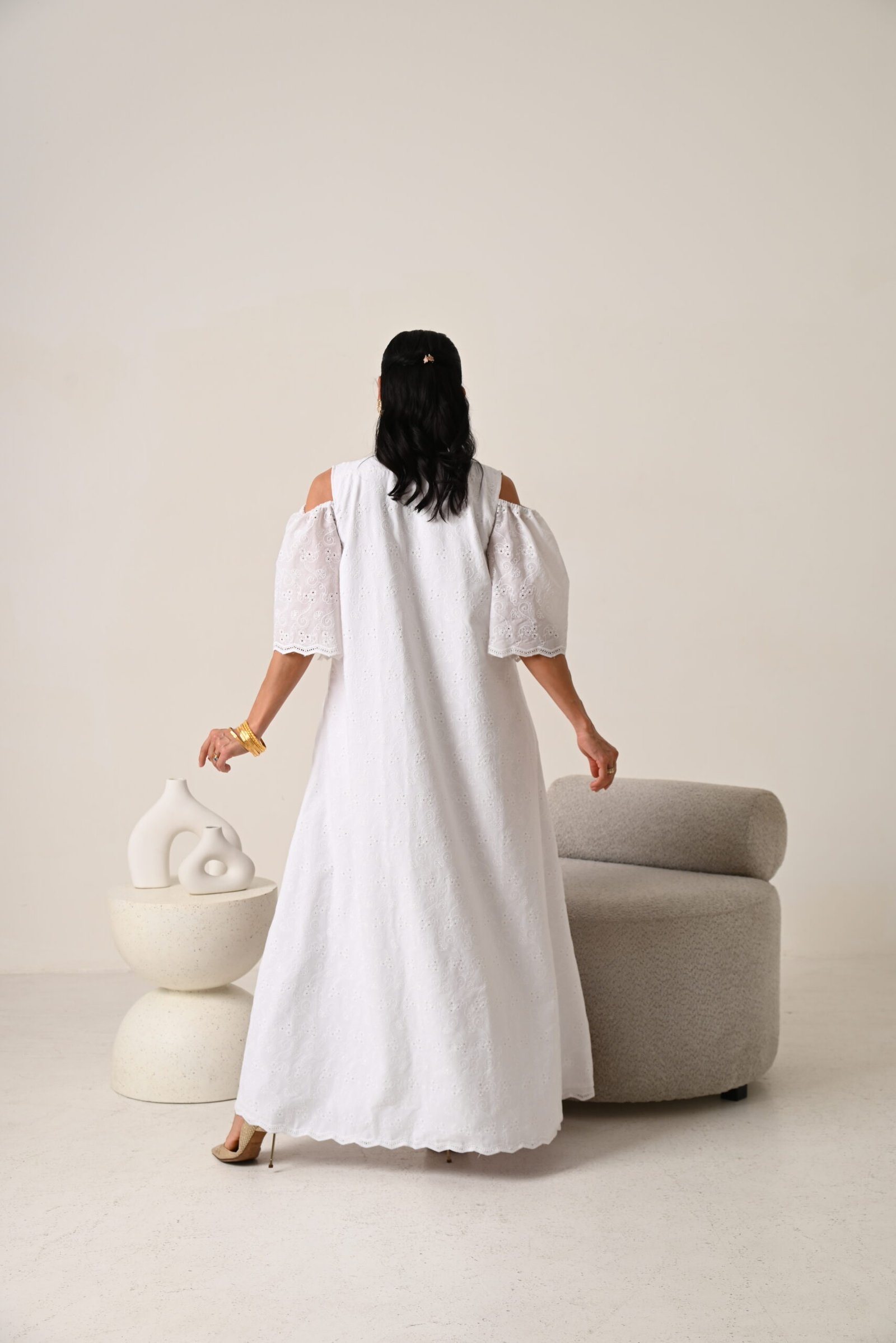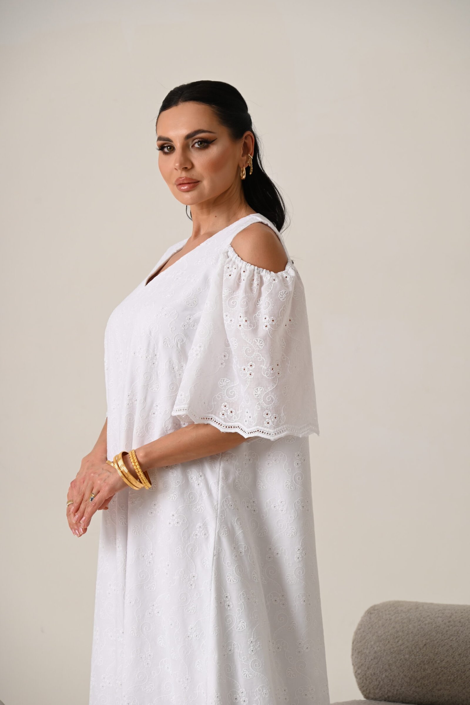 • جلابية بيضاء بنقوش متقنة تضيف لمسة فنية تزيد من جاذبية الجلابية